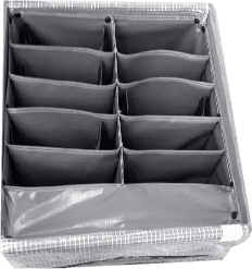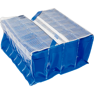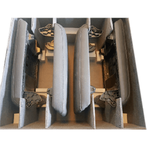b) Contenedores de plástico TOTE con dunnage de lona con cubrimiento de duvetina.