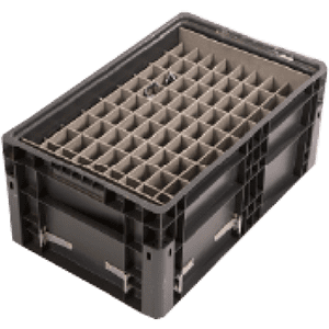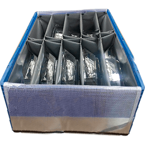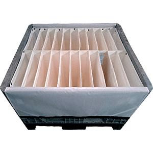 c) Contenedores de plástico TOTE con dunnage de plástico corrugado con recubrimiento de